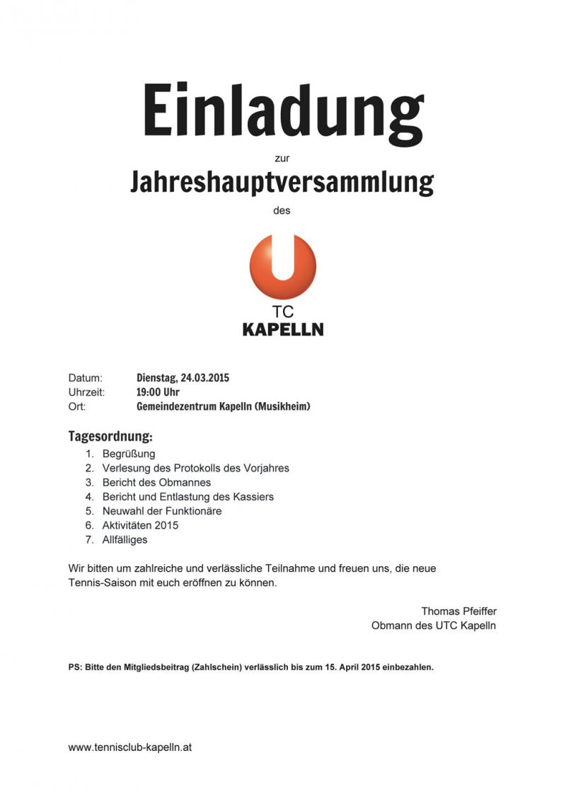 Am Dienstag, den 24. März 2015 um 19.00 Uhr findet im Gemeindezentrum (Musikheim) die jährliche Hauptversammlung statt.